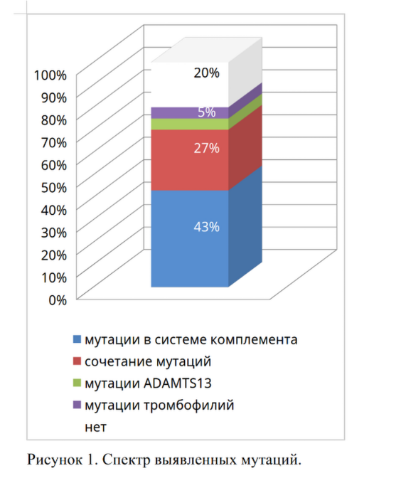 Результаты. У 68% пациентов с аГУС были выявлены мутации в системе комплемента. Среди характерных для аГУС мутаций чаще всего встречались мутации генов CFHR1, CFHR3 –13 пациентов (30%). Реже наблюдались мутации в генах С3 – 11 пациентов (26%), CFH – 8 пациентов (19%), CD46 – 2 пациента (5%). У 5 из 7 пациенток с акушерским аГУС были обнаружены характерные для аГУС генетические мутации (CFHR1, CFHR3, CFH, CFI, C3, CD46, THBD). Среди 11 пациентов с аГУС в собственных почках без заместительной почечной терапии у 6 были обнаружены патогенные мутации, которые в большинстве случаев (4 пациента) были представлены мутациями CFHR1, CFHR3. В группе пациентов с аГУС и терминальной ХПН патогенные мутации обнаружены у 8 из 10 пациентов, в группе аГУС и АТП – у 11 из 16 пациентов. В обеих группах чаще выявлялись мутации С3, CFH и CFHR1, CFHR3, а среди поражения органов-мишеней преобладало поражение сердца.