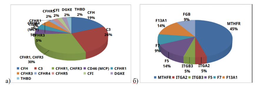 Рисунок 2. Мутации у пациентов с аГУС: а) характерные для аГУС мутации, б) мутации генов, ассоциированных с тромбофлией.
