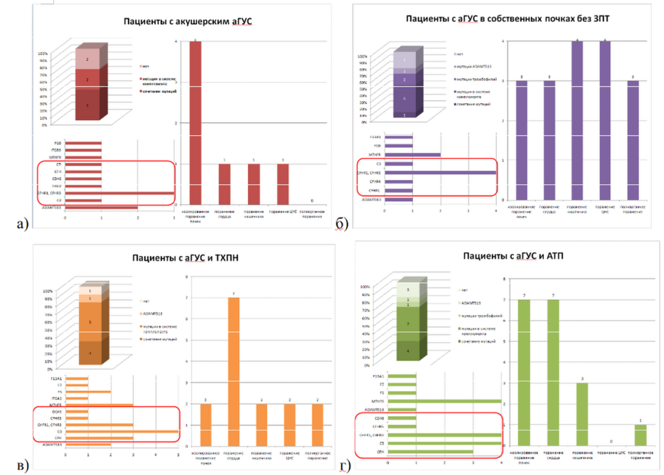 Рисунок 3. Спектр генетических мутаций и поражений органов-мишеней в группах пациентов с аГУС: а) пациенты с акушерским аГУС, б) пациенты с аГУС в собственных почках без ЗПТ, в) пациенты с аГУС и ТХПН, г) пациенты с аГУС и АТП. Красной рамкой выделены патогенные мутации.