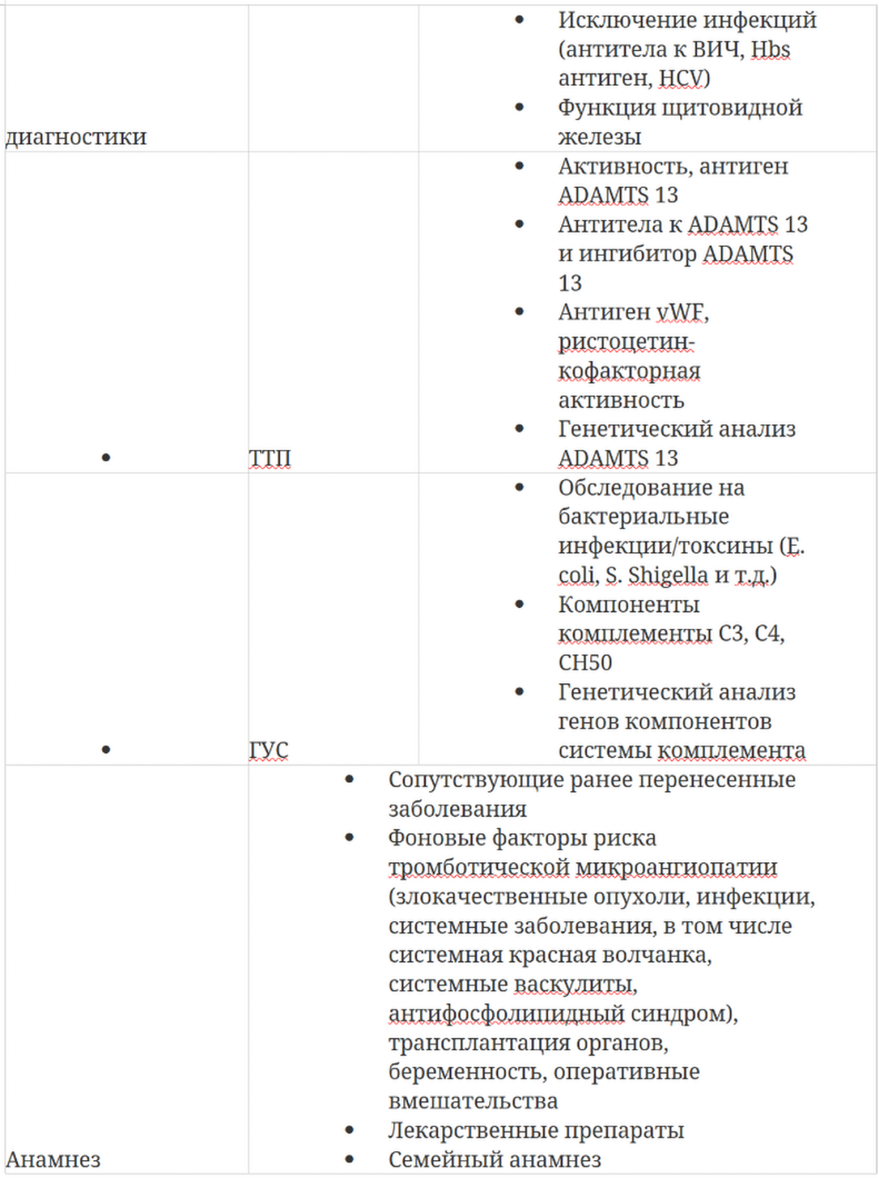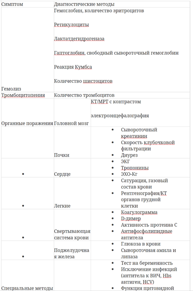 Диагностические подходы, используемые при тромботической микроангиопатии, описаны в табл. 2.