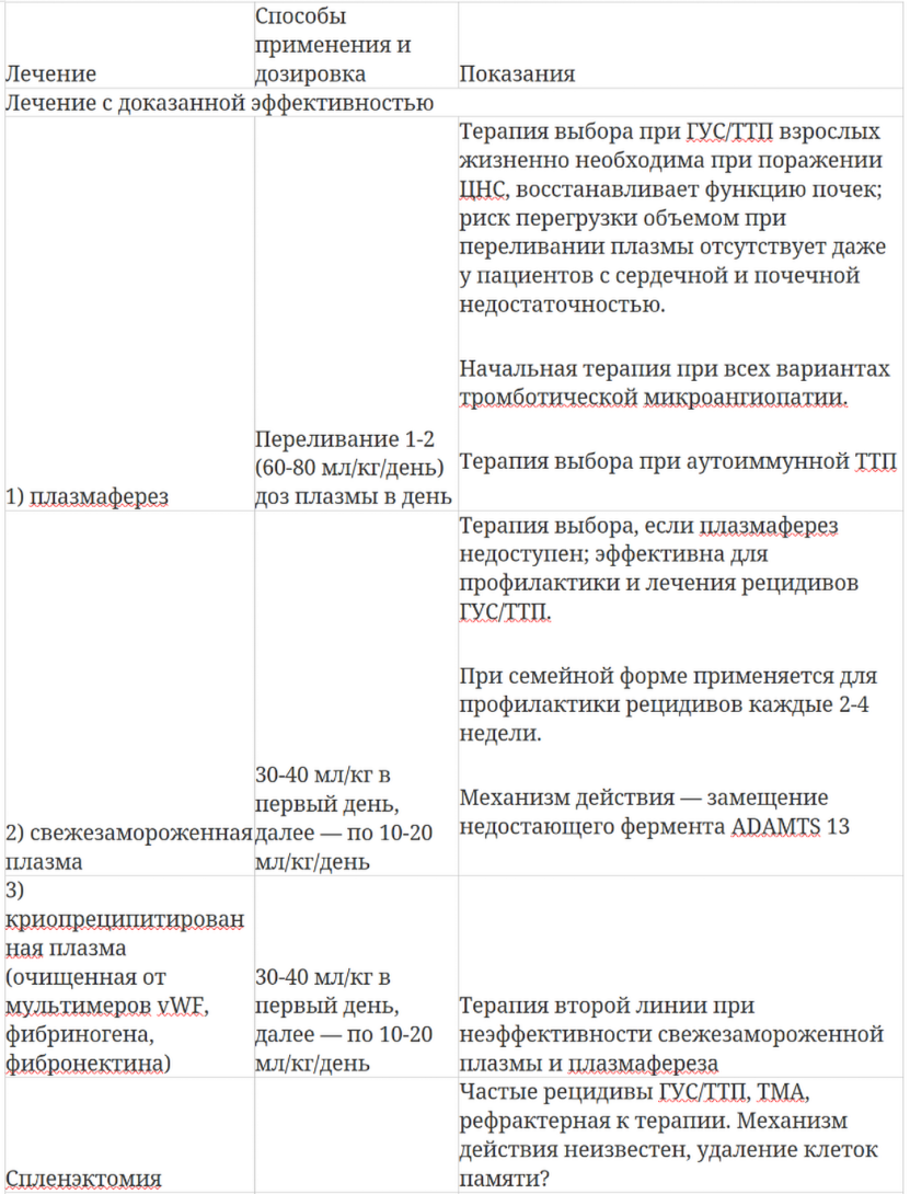 Терапией выбора при ТТП/ГУС является применение свежезамороженной плазмы или плазмаферез. Применение обменного переливания плазмы позволяет снизить уровень смертности при ГУС/ТТП с 80 до 10%. Впервые эффективность обменного переливания плазмы была показана у пациента с ТТП Rubinshtein в 1959 году. Целью применения плазмафереза является возмещение уровня vWF-протеазы, удаление антител, блокирующих активность ADAMTS 13, провоспалительных цитокинов, компонентов комплемента из системного кровотока, а также возмещение дефицита естественных антикоагулянтов, что особенно важно при сочетании ТТП/ГУС с генетическими тромбофилиями и АФС. При наследственной форме, обусловленной гомозиготной или двумя гетерозиготными мутациями ADAMTS 13, эффективно применение свежезамороженной плазмы, а для профилактики рецидивов заболевания переливания плазмы необходимо применять раз в 2-3 недели [37]. У больных с приобретенной формой ТТП, у которых дефицит ADAMTS 13 в большинстве обусловлен не абсолютным отсутствием этого белка, а блокадой его активности вследствие циркуляции аутоантител, только переливания свежезамороженной плазмы может оказаться недостаточным, так как имеющиеся антитела будут блокировать и вновь поступающие в организм количества ADAMTS 13. По данным Rocketal. (1991), плазмаферез является более эффективным по сравнению с применением свежезамороженной плазмы при приобретенной ТТП, что однако может быть связано с большим количеством переливаемой плазмы в процессе плазмафереза [30]. Кроме того, в условиях почечной и/или сердечной недостаточности, которые нередко развиваются на фоне острых эпизодов ТТП, введение значительных количеств свежезамороженной плазмы может вызвать объемную перегрузку. В связи с этим у данной категории больных предпочтение следует отдавать плазмаферезу. Тем не менее терапия свежезамороженной плазмой может быть эффективной и при приобретенной форме ТТП, так как вновь поступающих количеств ADAMTS 13 может оказаться достаточно, чтобы преодолеть ингибирующее влияние антител. Кроме того, инфузия свежезамороженной плазмой у больных с приобретенной формой ТТП должна быть начата сразу же после появления подозрения ТТП при отсутствии возможности начать плазмаферез в экстренном порядке или до того, как будет уточнен диагноз [38].