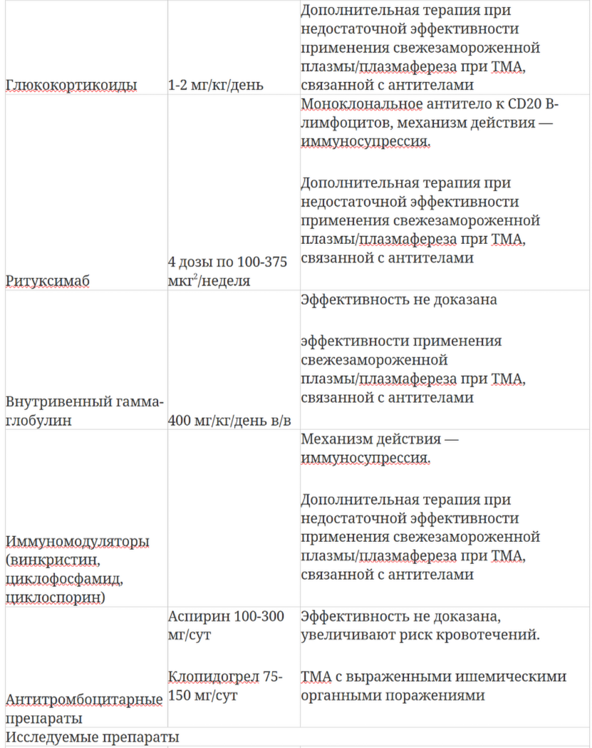 На сегодня для лечения ГУС/ТТП помимо терапии плазмой применяется целый ряд методов и лекарственных препаратов, однако эффективность большинства их них остается недоказанной (табл. 4). Эти методы направлены на подавления синтеза аутоантител и применяются у больных с приобретенной ТТП и аутоантителами к ADAMTS 13 при отсутствии эффекта от стандартной терапии с применением плазмафераза и свежезамороженной плазмы. Возможные варианты терапии включают высокие дозы глюкокортикоидов, ритуксимаб (ионоклональное антитела к CD20 на В-лимоцитах), в комбинации с циклофосфамидом, циклоспорин, спленэктомию. Так, появились данные о повышении эффективности терапии приобретенной ТТП при одновременном применении плазмафереза и глюкокортикоидов. BellWR и соавт. (1991) рекомендуют начинать преднизолон внутривенно в дозе 200 мг в день сразу же после установления диагноза ТТП и продолжать лечение с постепенным снижением дозы вплоть до выздоровления [39]. Терапию глюкокортикоидами со снижением дозы проводят еще в течение нескольких недель. При этом необходим постоянный контроль уровней тромбоцитов, чтобы не проследить рецидив ТТП. В случае возврата симптомов необходимо возобновить прежнюю интенсивную терапию (плазмаферез + высокие дозы глюкокортикоидов). Следует отметить, что шистоциты продолжают циркулировать в крови у больных, перенесших острый эпизод ТТП, в течение длительного времени и не могут служить ни маркером рецидива, ни признаком ремиссии заболевания.