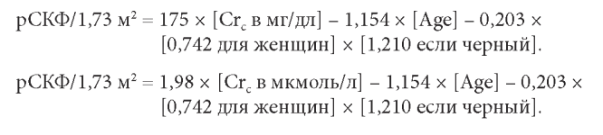 а) Формула Modification of Diet in Renal Disease (MDRD). Эта формула была разработана в исследовании MDRD и дает рСКФ, стандартизованную по площади поверхности тела в 1,73 м 2, для лабораторий, использующих стандартизованную по ID M S величину креатинина: