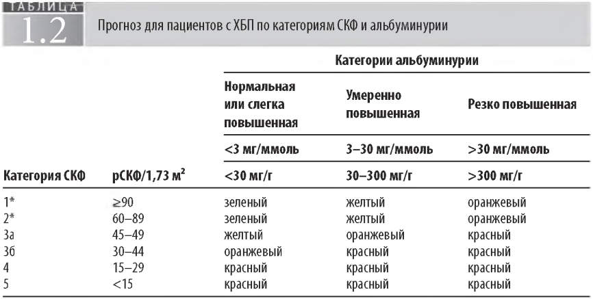 Примечание. Зелены й - нет повышенного риска, если нет других маркеров болезни почек, нет ХБП; желтый - умеренно повышенный риск; оранжевый - высокий риск; красный - очень высокий риск. * - нет ХБП, если нет изменений в моче, структурных или патологических изменений. Риск прогрессирования может быть умеренно повыш ен при определенны х болезнях почек. Модифицировано из: Kidney Disease: Im proving Global Outcomes (KDIGO) CKD W ork Group. KDIGO 2012 Clinical Practice Guideline for the Evaluation and Management of Chronic Kidney Disease. KidneyIntSuppl. 2013; 3: 1 -1 5 0 .