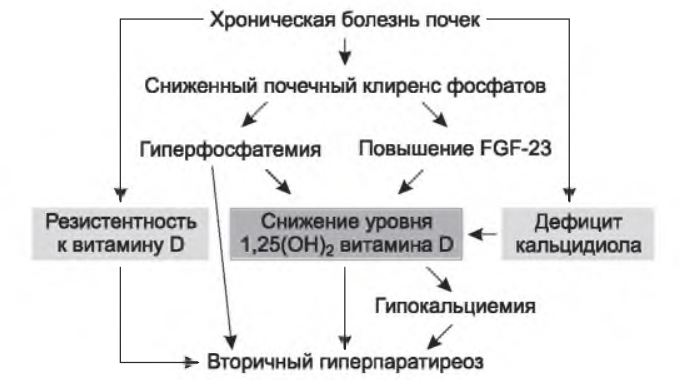 C. Минеральные и костные нарушения при хронической болезни почек (МкН-ХБП). Патогенез МКН -ХБП представлен на рис. 1.1. Коррекция уровня фосфатов, витамина D и паратгормона (ПТГ) у пациентов на диализе детально обсуждена в главе 36. Ниже затронуты только вопросы, относящиеся к додиализной ХБП.