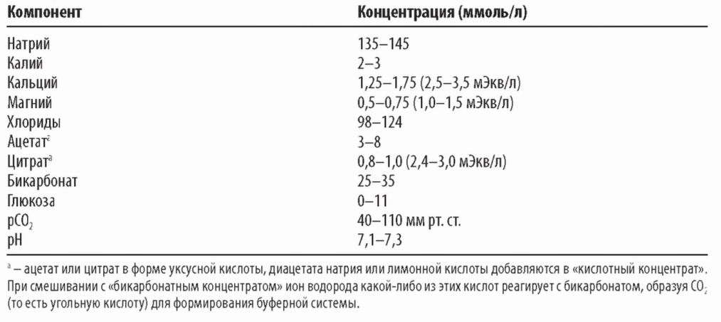 2. Кислота (лимонная кислота и диацетат натрия). Хотя уксусная кислота является жидкостью, сухой кислотный концентрат можно произвести, используя или лимонную кислоту, или натрия диацетат. Низкая концентрация цитрата в диализном растворе может связывать кальций плазмы, который прикрепляется к диализной мембране, препятствуя коагуляции и несколько улучшая клиренс диализатора, а также увеличивая возможную кратность повторного использования диализатора. В случае использования сухого кислотного концентрата, содержащего лимонную кислоту (0,8 ммоль/л) и небольшое количество уксусной кислоты (0,3 ммоль/л), после смешивания формируется раствор, который эквивалентен дополнительному уровню бикарбоната в 2,7 мЭкв/л.