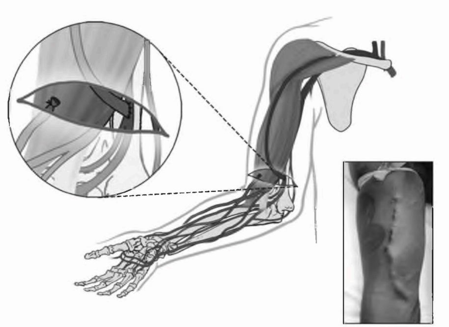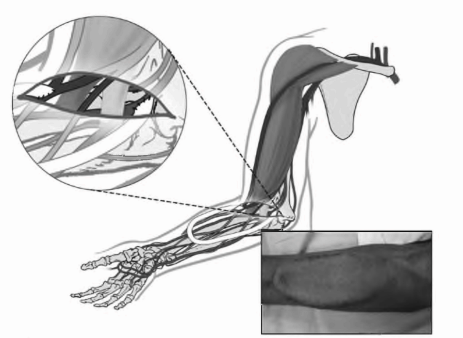 РИСУНОК 6.3. Артериовенозная фистула с базилярной веной, перенесенной к плечевой артерии. Воспроизведено с разрешения из Atlas of Dialysis Vascular Access - http://www.fistulafirst.org