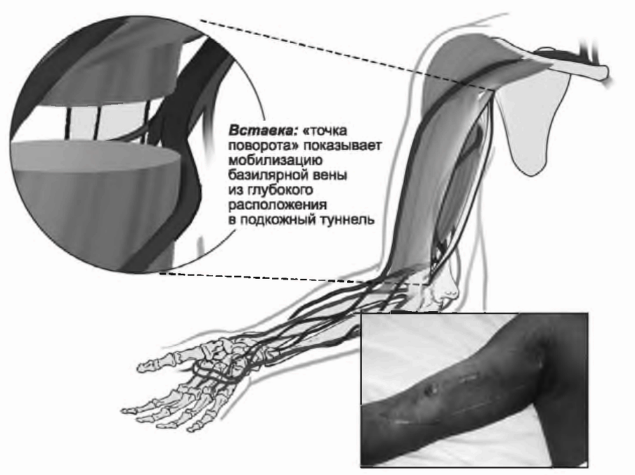 Перенесенная базилярная вена в верхней части плеча к плечевой артерии