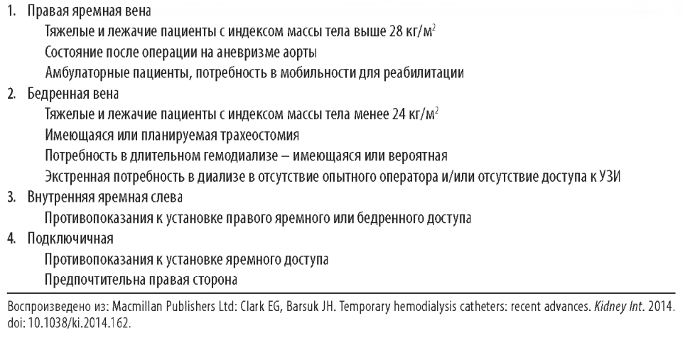 B. Место введения. Доступными местами введения являются правая и левая внутренние яремные вены, бедренная вена, подключичная вена. Порядок предпочтения различных мест установки представлен в табл. 7.1. Оптимальным местом введения является правая внутренняя яремная вена, поскольку венозный путь к правому предсердию относительно короткий и прямой. Следует, как правило, избегать использования подключичных вен, поскольку это связано с высокой частотой осложнений при установке (пневмоторакс, гемоторакс, перфорация подключичной артерии, повреждение плечевого сплетения) и высокой частотой центральных венозных стенозов (до 40%). Использование левой внутренней яремной вены для острого диализа не является оптимальным, поскольку венозный путь к правому предсердию более длинный и извитой. Если существует потребность в последующем хроническом гемодиализе, идеально отказаться от использования вен на верхних конечностях, чтобы ограничить риск развития стенозов в будущем. Бедренные вены в этом отношении имеют слишком строги, с учетом результатов недавних исследований (Dugue, 2012), где медиана времени колонизации кончика катетера составляла 14 дней. Если становится очевидным, что диализ потребуется более продолжительное время, яремный катетер без муфты можно заменить на катетер с муфтой. В случае если продолжительный диализ предполагается исходно, катетер с муфтой можно устанавливать с самого начала, если возможно, в правую внутреннюю яремную вену.