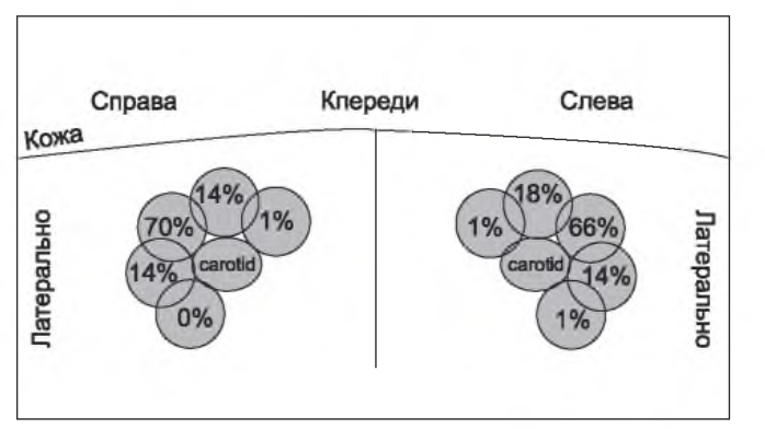 РИСУНОК 7.1. Анатомические вариации расположения яремной вены по отношению к каротидной артерии. Видоизменено из: Caridi JG, et al. Sonographic guidance when using the right internal jugular vein for central vein access. Am J Roentgenol. 1998; 171:1259-1263