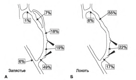 РИСУНОК 8.1. Типичные места стеноза артериовенозной фистулы. Представлены места стеноза для фистул, сформированных на запястье (А), и для фистул, созданных на плече (Б). Воспроизведено с разрешения из: Turmel-Rodrigues I, et al. Treatment of stenosis and thrombosis in haemodialysis fistulas and grafts by interventional radiology. Nephrol Dial Transplant. 2000; 15:2032-2036