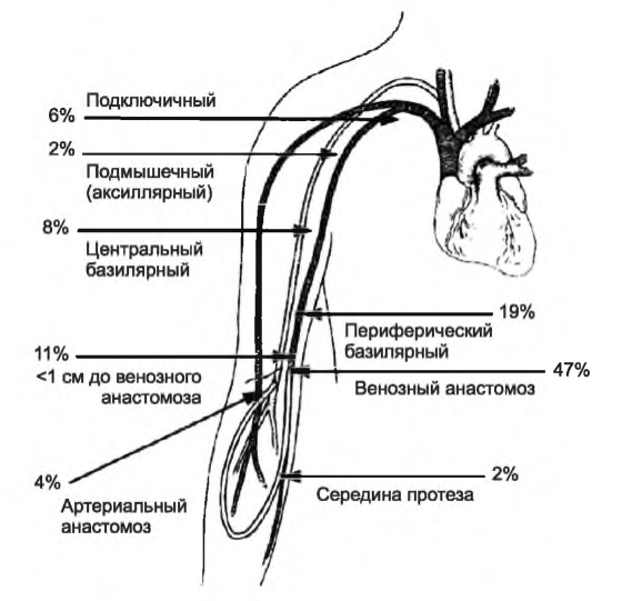 РИСУНОК 8.2. Типичные места стеноза артериовенозного протеза. Воспроизведено с разрешения Elsevier из: Roy-Chaudhury Р, et al. Vascular access in hemodialysis: issues, management, and emerging concepts. Cardiol Clin. 2005; 23: 249-273