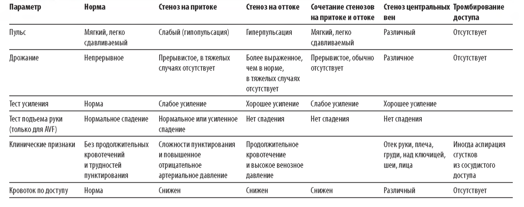 A. Физикальное обследование AV-доступа обсуждено в деталях в главе 6. В табл. 8.1 представлены изменения физикальных данных при типичных осложнениях доступа. Физикальное обследование может быть вполне полезно в выявлении изолированного стеноза на путях притока и оттока, но менее эффективно при комбинированном стенозе. Точность физикального обследования значимо выше у персонала, проходившего специальное обучение (Coentrao, 2012). Диализная сеть Техаса спонсировала ряд обучающих документов и примеров, доступных в Интернете (Beathard, 2012).