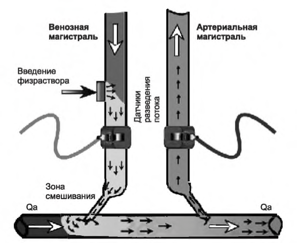 РИСУНОК 8.4. Измерение кровотока по доступу по разведению физраствором; показана перемена местами магистралей и положения датчиков. Детали см. в тексте. Воспроизведено с разрешения Transonic Systems, Inc, Ithaca, NY