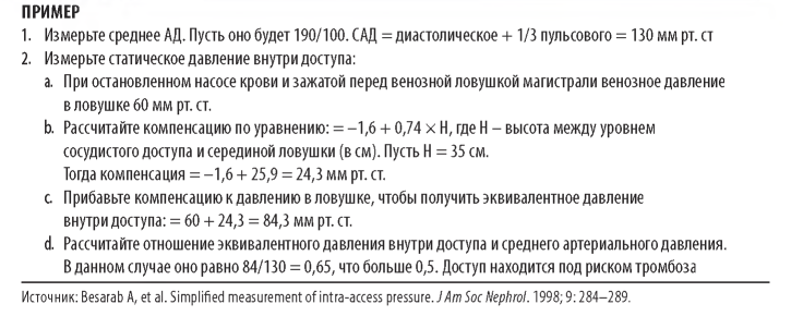 Чувствительность метода измерения давления в ходе диализа для выявления стеноза доступа можно увеличить, концентрируясь на измерении давления в начале диализа на низком кровотоке (200-225 мл/мин), поскольку при высоких кровотоках большая часть давления обуславливается сопротивлением иглы, а не ограничением сосудистого доступа. Исходное давление следует зафиксировать при первом использовании доступа. Пороговое давление, которое побуждает к дальнейшим исследованиям, зависит от размера иглы, вязкости крови и других факторов. Для иглы 15G стартовым пороговым венозным давлением могла бы быть величина выше 115-120 мм рт. ст., для игл 16G - выше 150 мм рт. ст. Такие пороговые значения должны быть превышены как минимум в ходе трех сеансов диализа, для того чтобы считаться значимыми.