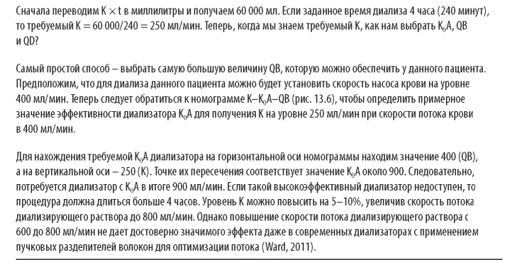 Самый простой способ поднять значение Kt/V с 1,4 до 1,5 - увеличить время диализа на 7%. Для четырехчасовой процедуры это будет 17 минут (1,07 х 240 = 257 мин). В качестве другого варианта можно попробовать увеличить параметр К, перейдя на большую скорость потока крови, более производительный диализатор или большую скорость потока диализирующей жидкости. Часто бывает сложно поднять скорость потока крови выше определенного предела. Эффект от перехода на более эффективный диализатор можно оценить по номограмме зависимости клиренса от К0А на рис. 3.6. Повышение скорости потока диализирующего раствора до 800 мл/мин, которое обычно дает прирост клиренса на 5-10% при условии, что скорость потока крови >400 мл/мин, не всегда эффективно на некоторых современных диализаторах, где поток диализирующей жидкости изначально оптимизирован (Ward, 2011).