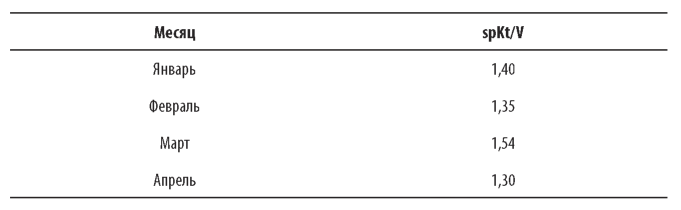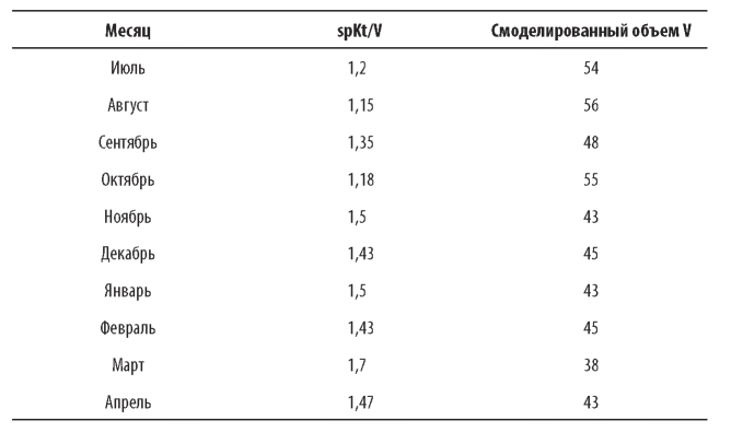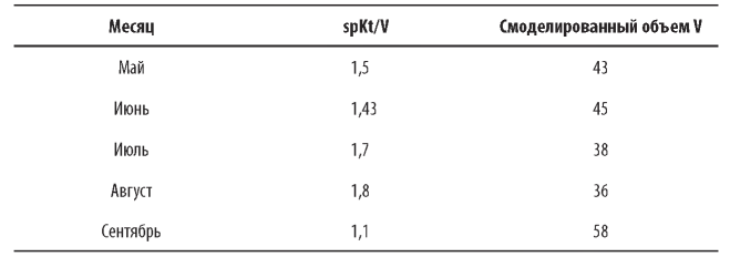 Пример 1. У пациента в мае был достигнут уровень spKt/V в 1,5 ед., и компьютер смоделировал объем V = 43 л. Данные параметров, соответствующие последующим четырем месяцам, приведены ниже.