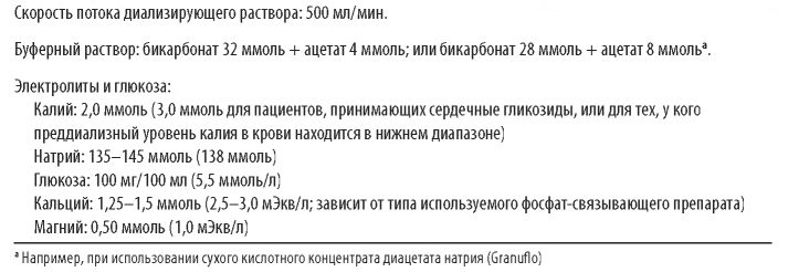2. Уровень калия в диализирующем растворе. Обычная концентрация калия в растворе - 2 ммоль. Если преддиализный уровень калия в плазме <4,5 ммоль или пациент принимает сердечные гликозиды, концентрация калия в диализирующей жидкости должна быть увеличена до 3,0 ммоль. Если при использовании раствора с концентрацией калия 3 ммоль пробы крови во время диализа покажут повышенный уровень калия в плазме, может потребоваться постоянный прием полистиролсульфоната натрия. В настоящее время проходят клинические испытания новых, потенциально более безопасных и эффективных веществ, связывающих калий в ЖКТ, таких как ZS-9 (ZS Pharma, США) и Patiromer (Relypsa, США).