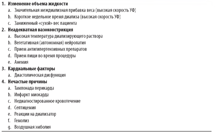 I. ИНТРАДИАЛИЗНАЯ ГИПОТЕНЗИЯ. Интрадиализная гипотензия (ИДГ) - осложнение, требующее повышенного внимания. Это важно не только потому, что ИДГ может вызвать резкое ухудшение самочувствия пациента во время диализа, а еще и потому, что она связана с высокой летальностью (Flythe, 2014) и увеличением частоты локальных аномалий сокращения сердечной стенки, обозначаемых как «станнинг» или оглушение миокарда (McIntyre и Odudu, 2014). Существуют различные определения ИДГ, включая максимальное снижение систолического давления ниже 90 мм рт. ст., или снижение систолического давления на 20-30 мм рт. ст., или снижение АД на определенный процент от исходного (додиализного). Для целей оценки качества лечения определение ИДГ как снижение систолического давления ниже 90 мм рт. ст. может быть наиболее полезным, поскольку именно в этом случае имеется четкая связь с повышением летальности (Flythe, 2014). Чаще всего ИДГ встречается у пациентов с низким артериальным давлением перед сеансом диализа. Это может являться признаком функциональных или органических нарушений в сердце, из-за которых оно не способно обеспечить необходимую гемодинамику во время выведения из организма жидкости. ИДГ также увеличивает риск тромбоза сосудистого доступа (Chang, 2011). Причины, приводящие к возникновению ИДГ, представлены в табл. 12.1.