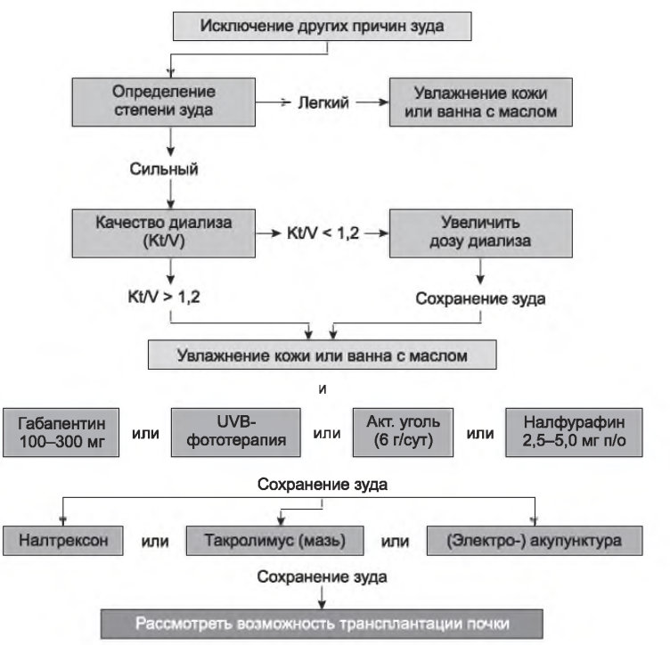 При хроническом зуде в качестве первого средства необходимо смазывать кожу увлажняющими и смягчающими средствами. Далее следует убедиться, что доза проводимого диализа адекватна, а уровень Kt/V не менее 1,2, хотя доказательств, что повышение Kt/V уменьшает зуд, недостаточно. Зуд часто встречается у пациентов с повышенными уровнями кальция и фосфора и/или значительно повышенном уровне ПТГ; показано снижение фосфора, кальция (до нижнего предела нормальных значений) и уровня ПТГ.