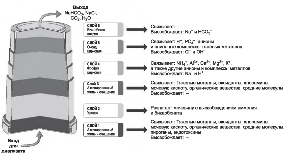 A. Сорбционный картридж. Картридж с сорбентом (рис. 19.1) содержит 6 слоев материалов, предназначенных для удаления загрязнителей диализирующего раствора и уремических токсинов с одновременным поддержанием его оптимального состава. Диализат проходит через колонку, снизу вверх. Первый и третий слои содержат активированный уголь. Они адсорбируют тяжелые металлы, хлорамины и другие контаминанты, которые могут содержаться в водопроводной воде. Кроме того, активированный уголь поглощает ряд органических среднемолекулярных уремических токсинов, содержащихся в отработанном диализате, включая креатинин и мочевую кислоту. Второй слой содержит иммобилизованный фермент - уреазу, который катализирует превращение мочевины в бикарбонат аммония. Четвертый состоит из фосфата циркония и является катионообменным. Его первичная функция - адсорбция ионов аммония NH/, образующихся при гидролизе мочевины, происходящем во втором слое. Кроме того, данный катионообменный материал адсорбирует другие положительно заряженные ионы, такие как магний, кальций и калий, а также катионы тяжелых металлов, которые могут содержаться в водопроводной воде - например, медь и железо. В обмен на поглощенные катионы фосфат циркония высвобождает водород и натрий. Пятый слой, анионообменный, содержит оксид циркония. Этот материал адсорбирует ионы фосфата, фторида и оксоанионы тяжелых металлов, а в обмен выделяет анионы хлора и гидроксид-ион. Шестой слой содержит бикарбонат натрия. Он ничего не связывает, а выступает источником натрия и бикарбоната.