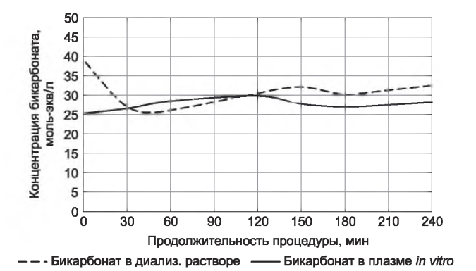 РИСУНОК 19.2. Профиль концентраций бикарбоната в плазме in vitro и в диализирующем растворе при использовании шестислойной сорбционной колонки