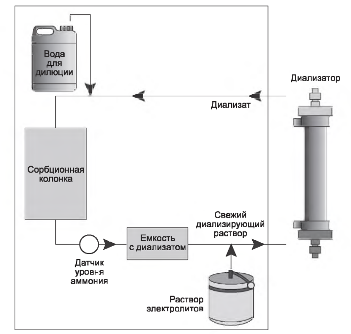 В данном методе диализат пропускается через картридж с сорбентом. Диализный раствор готовится из 6 литров питьевой водопроводной воды и сухих концентратов в отдельной емкости. Перед тем как начать диализ, этот раствор пропускают через картридж с сорбентом в режиме рециркуляции - с целью удаления возможных загрязнений. Такая рециркуляция несколько изменяет состав электролитов раствора, о чем мы поговорим ниже. После того как пациент подключен к экстракорпоральному контуру и диализ начат, диализат направляется из выходного порта диализатора в картридж с сорбентом. В этом картридже продукты метаболизма, растворенные в диализате, адсорбируются и/или заменяются ионами натрия, водорода и бикарбоната. Правда, раствор теряет еще и калий, кальций и магний, поэтому его регенерация завершается восполнением этих веществ с помощью насоса для инфузии на выходе из картриджа.